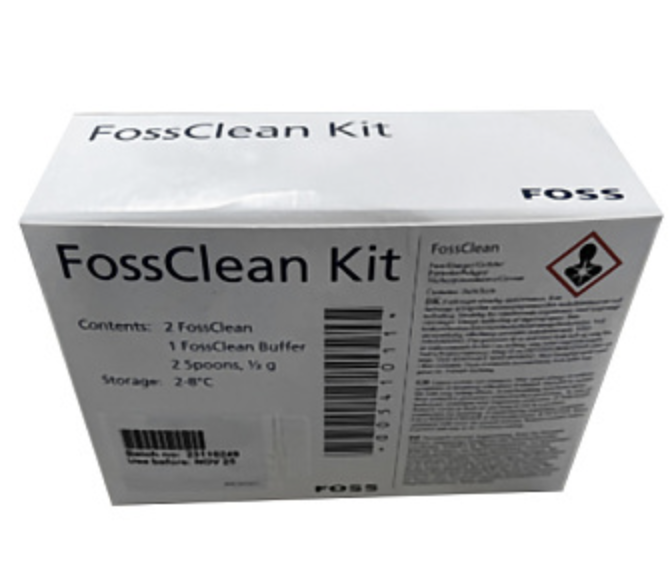 FossCleanKit须在5°C冷藏保存。包装一盒FossClean包括2瓶50ml的FossClean溶液(为与其它液体相区别,其为桔黄色);和1瓶10g的FossCleanBuffer药粉(白色),2只塑料药匙。强力清洗液的配置 1.取0.5gFossCleanBuffer药粉(1满塑料药匙)溶于略少于500ml去除离子水或蒸馏水中; 2.取FossClean溶液(桔黃色)10ml加入上述Buffer溶液中再加入去除离子水或蒸馏水定容到500ml即可;3.混合均勻即完成强力消洗剂的配制。08con注:可根据用量和储藏量减半或加倍配制。强力清洗液的储藏配置后的FossClean溶液须在5°C冷藏保存,有效使用期限不超过7天。使用方法1.使用前一次使用将用量的配置好的FossClean溶液预热到大约40°C;2.仪器首先清洗并进行调零; 3.将FossClean液放于取样管下; 4.再单击菜单Analysis项下的Soak选项将桔黄色溶液吸入仪器的流路系统,并使强力清洗液保存在仪器内浸泡一个晚上;(可以在做了Soak后30分钟关闭FT120系统).5.第二天早晨再用清洗液冲洗,然后再调岺。