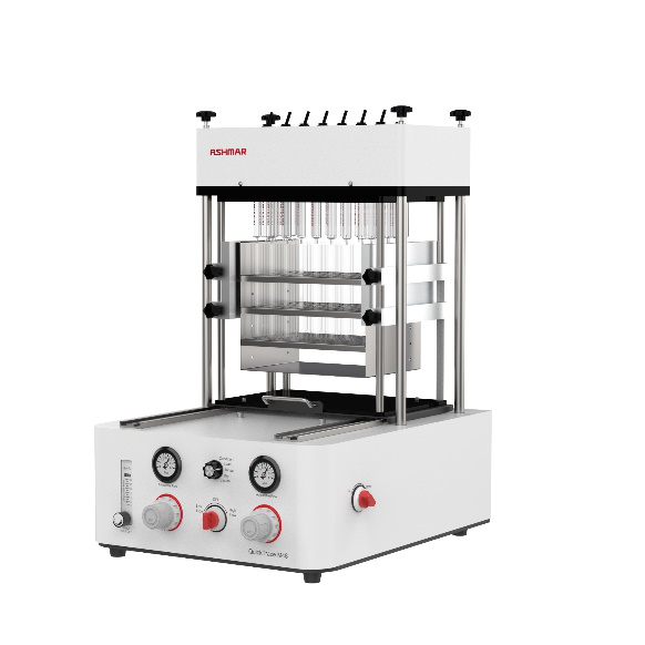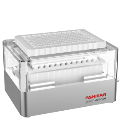 ① 萃取板,萃取样品② 密封罩,形成密闭环境③ 孔板,收集样品④ 负压底座装置,与密封罩组合,形成真空仓配置清单:系统主机序号 名称 数量 名称 数量1 试管架 1 pcs 负压底座 1 pcs2 玻璃槽 1 pcs 废液池 1 pcs3 密封盖 1 pcs 密封罩 1 pcs4 两通阀 12 pcs 垫高块 1 pcs5 真空表 1 pcs 真空表 1 pcs6 真空泵 1 pcs 真空泵 1 pcs7 软管 1 pcs 软管 1 pcsQuickTrace MV96安装流程:1、 打开包装取出部件(部件包括,负压底座、废液池、垫高块、密封盖、软管、真空表、真空泵);2、负压底座放置于平稳的桌面上;3、将废液池放置于负压底座内;4、将密封罩盖在底座上;5、使用软管连接负压底座与真空泵;QuickTrace MV96使用流程:1、将96孔萃取板放置于装置正上方;2、移液器向萃取板中加入液体;3、打开真空泵,液体流进废液池;4、液体全部进入废液池,关闭真空泵;5、将废液池更换为96孔板,重复加液操作并收集萃取液。注意事项:A. 装置使用的抽真空压力不应大于0.1Mpa。B. 当系统达不到设定压力时,请检查各接头是否拧紧,气压盖密封垫是否平整,软管是否有老化破损。C. 系统的负压力一般不应超过-0.09Mpa。D. 使用时注意做好防护,小心有机试剂可能对身体造成伤害。