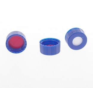 用于9mm样品瓶的蓝色开孔螺纹盖(含红色PTFE/白色硅胶隔垫、预开口),非 Bonded 盖子,适合较细的进样针,保证进样针进样时不被扎弯或者折断。蓝色开孔螺纹盖(含红色PTFE/白色硅胶隔垫、预开口) 货号:VEAP-5397-09B-100C